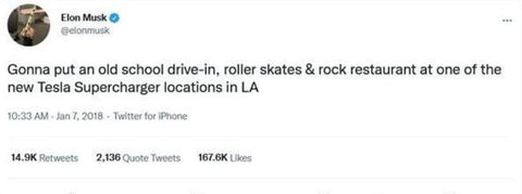 In fact, Musk tweeted four years ago that he wanted an old-fashioned drop-off-free Tesla Supercharger restaurant with roller skating and rock 'n' roll elements in Los Angeles. So, Musk's " side business " plan will soon be implemented on the ground, as for the restaurant opening atmosphere, you can refer to the Texas factory opening ceremony.